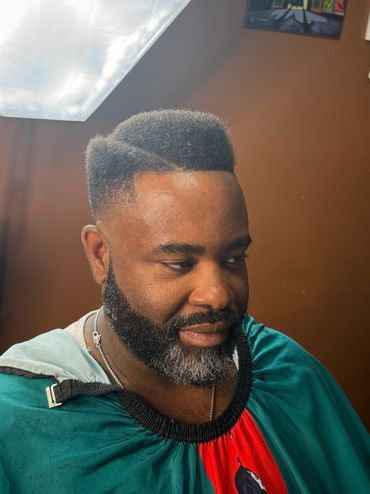 An exceptional hair cut that includes a beard trim and line up.